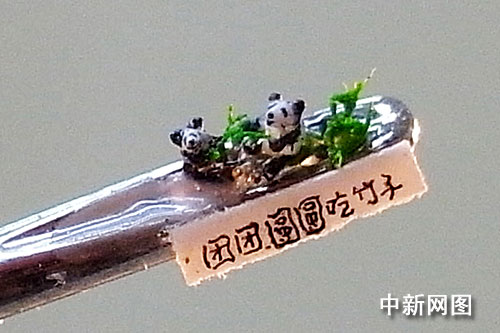 为纪念大熊猫团团、圆圆来台与民众见面。台湾著名微雕家陈逢显特在针孔上以树脂创作“团团圆圆吃竹子”的作品。其中大只熊猫高0.5毫米,小只熊猫高0.4毫米。中新社记者:陈立宇 摄