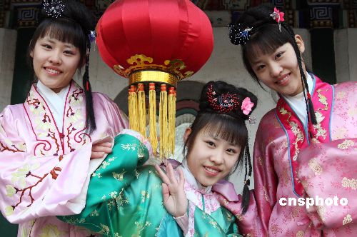 1月27日 (大年初二),北京大观园十四届红楼庙会吸引众多假日游客,本届庙会以弘扬中华传统文化为宗旨,以展现红楼文化为主题,呈现出改革开放30年来新北京、新宣武的精神风貌。庙会主要活动有“元妃省亲”、“宝黛成婚”“贾母贺寿”、红楼文化展览--木版年画展、红楼梦人物火花展以及红楼美食展示区等。图为在北京大观园2009年红楼庙会上由三胞胎李鑫、李淼、李晶扮演的红楼人物。中新社发 钱兴强 摄