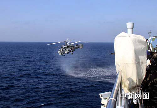 中新网“海口”舰亚丁湾1月31日电 当地时间1月29日上午,中国海军护航编队“海口”号导弹驱逐舰数名特战队员由舰载直升机滑降到被护香港“鹏程”号商船上,执行“海口”舰第一次实施的随船护卫行动。图为直升机从“海口”舰起飞奔赴被护香港商船。