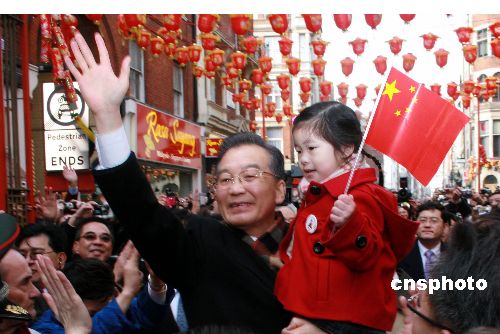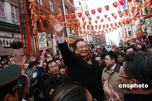 当地时间31日下午,中国总理温家宝抵达伦敦后从机场直接前往唐人街,向华人华侨拜年。
