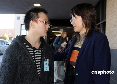 当地时间一月三十一日下午,中国驻洛杉矶副总领事黄晓健(右)在内华达大学医疗中心和中国游客小洪(左)交谈。小洪是没有参加大峡谷一日游而躲过一劫的五名中国游客之一,而小洪的父母受伤严重,尤其是母亲伤势危重。中国游客当地时间一月三十日下午在美国亚利桑那州的九十三号公路上遭遇严重车祸,造成七人遇难、十人受伤。中新社发 张炜 摄