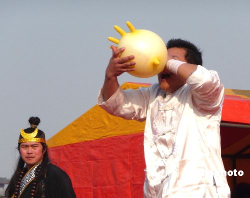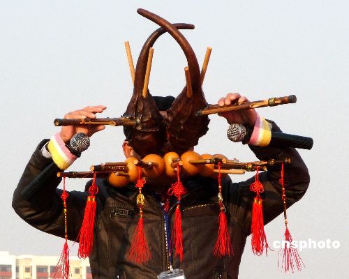同时演奏九个葫芦丝。中新社发 玉龙 摄
