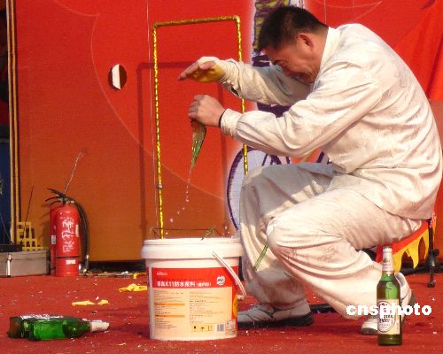 铁砂掌击碎啤酒瓶。中新社发 玉龙 摄