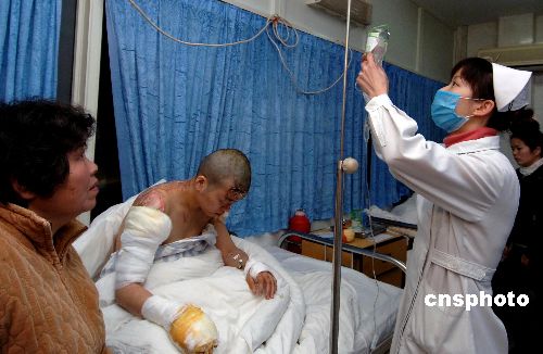 二月一日,福建长乐酒吧特大火灾中的一名中度烧伤女青年,在南京军区福州总医院烧伤科接受医护人员的紧急救治。目前,火灾中所有受伤人员已紧急送至福建医科大学附属协和医院、福州市第一医院等福州多所医院进行全力抢救、治疗。一月三十一日二十三时五十五分,福建福州长乐市区一酒吧因年轻人生日聚会在桌面上燃放烟花引燃天花板酿成特大火灾,现已导致十七人死亡。