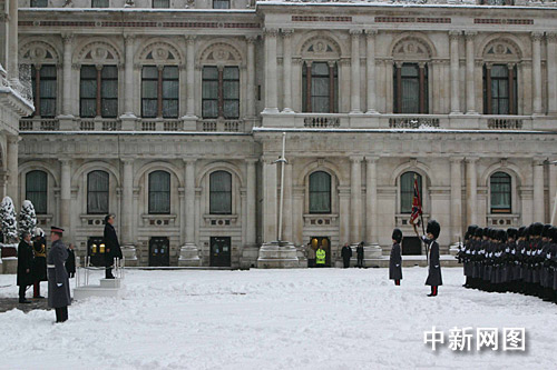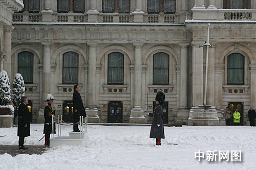 伦敦当地时间二月二日上午八时三十分许,正在对英国进行正式访问的中国总理温家宝,踏雪出席布朗首相在外交部举行的欢迎仪式。图为温家宝在观礼台上检阅仪仗队。 中新社记者 张朔 摄