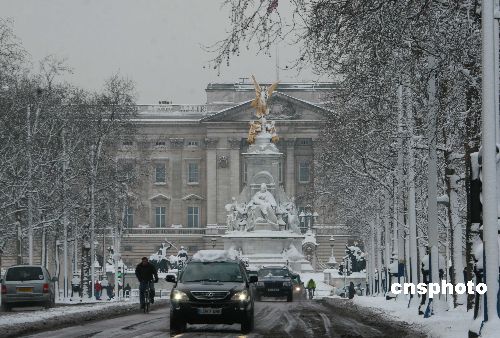 英国自1日下午起开始降雪,至2日早晨已经成为十八年最严重的暴雪。恶劣天气使公共交通陷入停顿或瘫痪,首都伦敦的公交车停驶,地铁线也陷入混乱状况。图为大雪中的英国王宫白金汉宫。