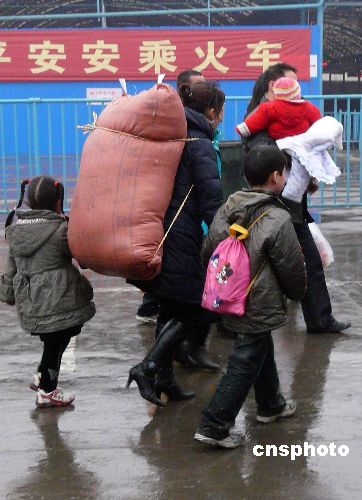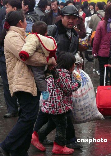 2月2日,春节过后,在湖北武汉市汉口火车站广场上,不少农民工拖儿带女乘车外出去打工,让这些孩子在社会生活的酸甜苦辣中磨练长大。中新社发 李长林 摄