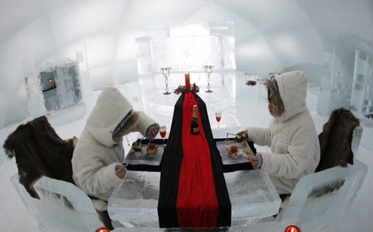 2月3日,在日本北海道的占冠一所冰旅馆内举行的媒体展上,两名女子正在享用晚餐。