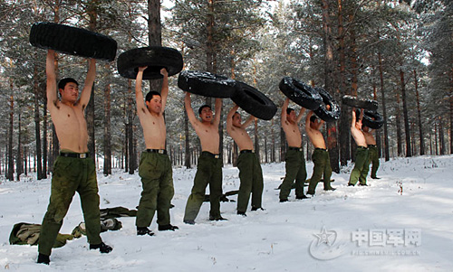 雪深,三十公分;温度,零下二十四度;地点,樟子松原始林环抱的训练场;人员,特战八连的全体官兵;科目,抗寒体能训练。为了提高大家的耐寒冷能力,所有科目都是在赤着上身的情况下进行,8点47分,连长柳广林一声令下,官兵开始了轮胎操训练,挺举、搬运几十斤重的轮胎举重若轻,吼声如雷震山林!接着是原木操训练,风雪中疾步如飞,四人一组,在锻炼臂力和腰部力量的同时,也考验了大家的协调配合能力。经过体能训练操的热身之后,特战连分成两组,进行雪地拔河对抗,两军对垒,寸土必争,聚力拔山河气盖世,热血傲严寒多壮志!激扬冰雪,激励斗志,硬汉们完全忘记了是在寒冷雪海中,正象团参谋长陈德凯所说的那样:“我们身处偏远不寂寞,对抗严寒不觉冷,不仅因为我们肩负的责任,还有我们面对地势、气候考验时所激发出的那种无可比拟的斗志,那代表了我们一代代官兵传承下来的战斗精神和意志,只有这样的磨砺,才对得起我们背后的祖国!”