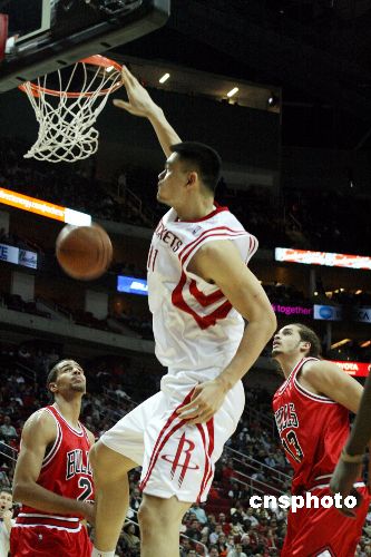 当地时间2月4日,火箭队主场107比100击败公牛队,取得两连胜的同时也保持了对公牛连续三年不败的纪录。姚明12投9中,8个篮板,4次盖帽,贡献全场最高的28分。图为姚明扣篮。中新社发 欧文 摄