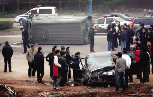 昨日(4日)一早,渝AJ0216的运钞车在大渡口跳磴执行完运钞任务,沿华福路返回。当车行进到一个路口时,运钞车驾驶员李小平(音)发现前面一辆轿车正欲变道。