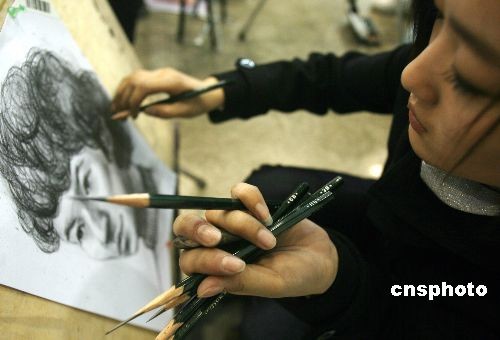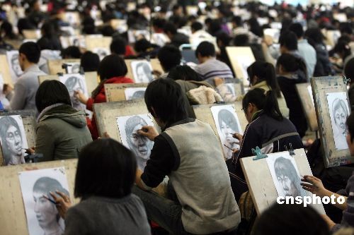 2月5日上午8点整,山东省2009年艺术类考生艺术专业考试正式拉开帷幕。山东工艺美术学院由于考生人数众多,将考场搬进了20000余平方米的济南市舜耕会展中心,让近7000多名美术类专业考生在展厅内同时参加考试,一展身手。