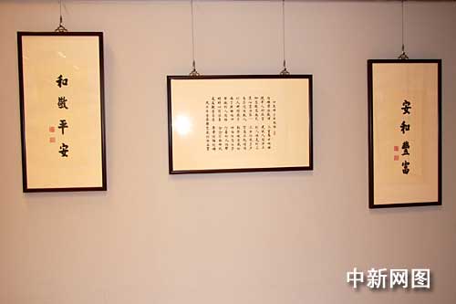 台湾法鼓山创办人圣严法师三日圆寂,四日移灵金山法鼓山世界佛教教育园区大殿供信众瞻仰,图为法鼓山现正展出的圣严法师墨宝。中新社记者:陈立宇 摄
