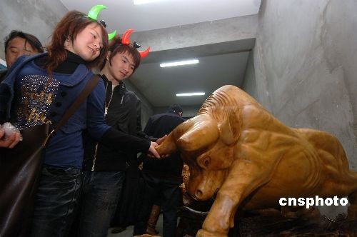 2月5日晚,一对戴着“牛角”的情侣共同摸一雕塑牛角祈求好运。牛年伊始,福州许多市民走上街头游玩,看到牛造型的饰品都会摸之祈求好运。中新社发 王东明 摄