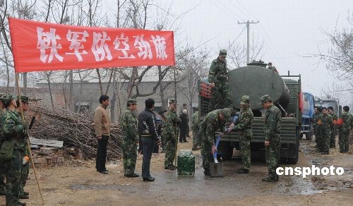 二月六日上午,驻豫六百多名解放军官兵专程赶赴民众吃水困难的河南省新郑市辛店镇李庄村,将“甘霖”送入民众家中。二00八年十一月以来,河南省气偏高,干旱少雨,遭受自一九五一年以来的特大旱情,农作物受旱面积达到百分之六十三点一,四千一百多万亩麦田受旱灾,部分地区出现临时性人畜饮水困难。
