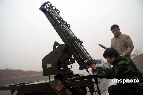 2月7日,河南济源市为缓解旱情,密切关注天气变化,抓住有利时机,当天下午在4个地点同时使用火箭和高炮进行人工增雨作业。