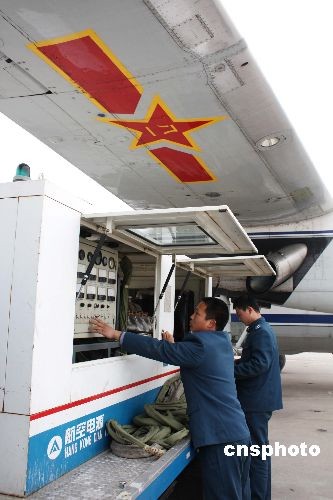 官兵为增雨飞机补充电源。