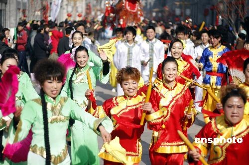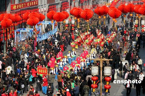 2月9日上午,来自北京、河北、山东等3个省市的12支花会队,在前门大街举行“传统民间花会踩街”活动,喜迎正月十五元宵节的到来。踩街是一种中国传统民间民俗艺术表演形式,类似国外的花车游行,表演队伍边行进边表演,游客沿途观看。花会队从正阳门箭楼南侧和前门五牌楼出发,16只南狮和北狮为大队人马开道,随后中幡、旱船、二魁摔跤、地秧歌、鼓子秧歌等将依次向珠市口行进。
