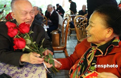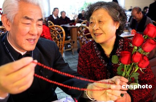 2月9日,中国传统元宵佳节到来之际,北京植物园上演的“浪漫玫瑰文化周”吸引99对金婚夫妇共度元宵佳节,特邀而来的金婚夫妇(结婚满50年)手捧着政府当年颁发的不同版本的结婚证,相互献上象征爱情的红玫瑰、相思红豆,交换金婚礼物,重温爱的誓言,在鲜花前回忆浪漫的美好时光,许多长者回忆起风风雨雨几十年的时光,激动得热泪盈眶。中新社发 钱兴强 摄