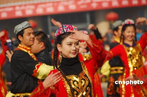 2009年2月9日,新疆塔克拉玛干沙漠腹地边城和田锣鼓喧天,万民欢腾,各族儿女身披节日的盛装,载歌载舞,在和田市广场举行大型社火活动,表达和田各族人民的美好祝愿。