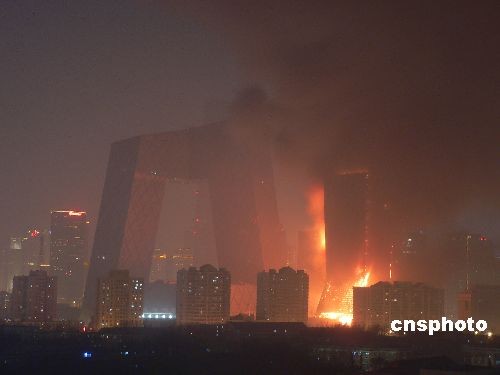 2009年2月9日晚,北京市京广桥附近的央视新大楼北配楼发生火灾。 中新社发 马毅行 摄