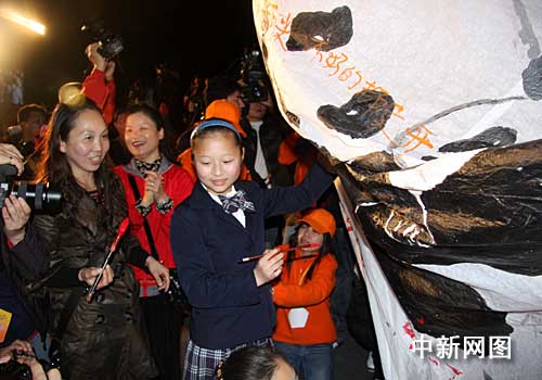 图为应邀随团来台的十三岁四川“抗震救灾英雄少年”阳玉洁(中)正准备在四川成都东羽蜀都灯会提供的印有大熊猫团团圆圆图案的主灯上题字祈愿。记者 陈立宇 摄