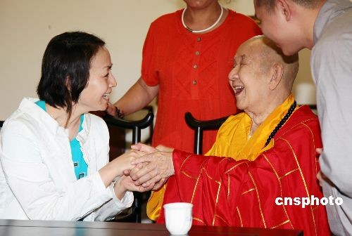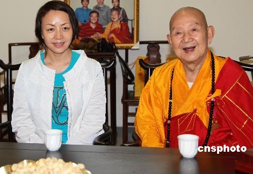 2月9日,著名演艺明星宋丹丹前往三亚度假过元宵节。一身休闲穿着打扮的宋丹丹游览三亚南山景区,瞻仰南海观音,感受三亚美丽风光,欢度休闲假期。图为宋丹丹在游览三亚南山景区时拜访南山寺方丈、九旬高僧新成大和尚。中新社发 陈文武 摄
