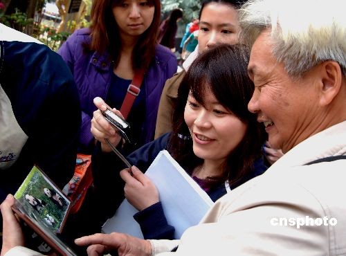 2月11日,一名大熊猫志愿者在福州熊猫世界向前来拍摄大熊猫专题片的台湾电视台摄制组人员,展示他本人珍藏的盖有台北邮戳的大熊猫“团团”“圆圆”明信片。