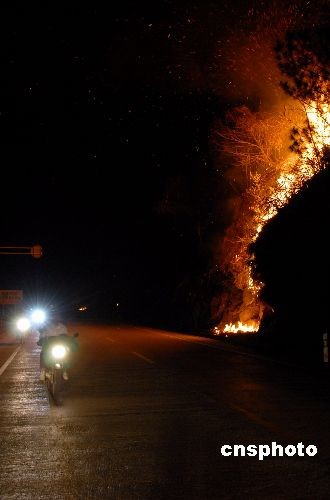 图为高砂镇境内的公路上,来往的车辆从火丛旁穿流而过。中新社发 李剑准 摄