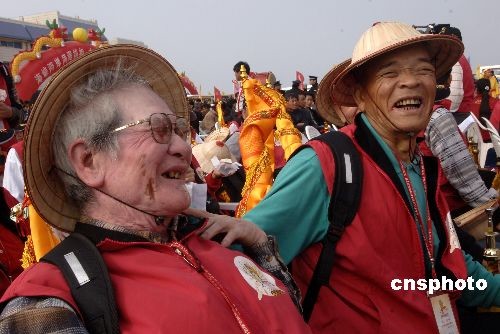 2月13日,首次到湄洲岛进香的台湾妈祖信众李桂春(左)、赖水上(右)笑开怀。中新社发 王东明 摄