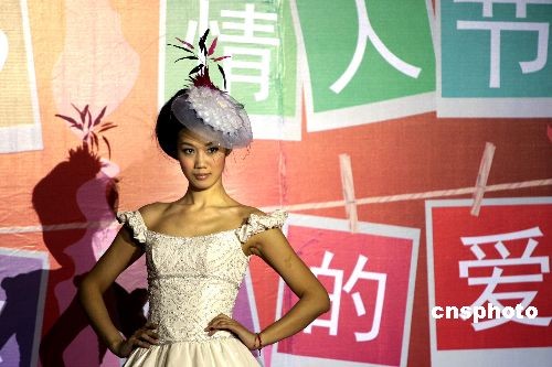 2月13日,情人节前夕,各商家纷纷想出办法紧抓商机。某商家在商场内为情人们奉献上一场婚纱展,此展览将持续三天,模特每天将分时段在商场T台上为顾客展示多样婚纱。中新社发 富田 摄