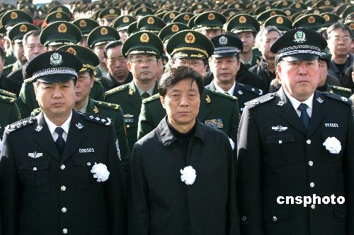 图为央视台长赵华勇(中)和北京市公安局局长马振川(右)等参加追悼会。中新社发 富田 摄