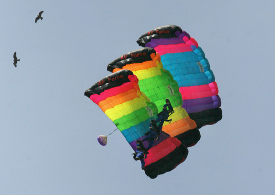 中新网2月14日电 南亚最大的航空展印度航展仍在继续进行。13日,航展中又上演了多场空中特技表演的好戏。图为当日举行的精彩的空中特技跳伞表演。
