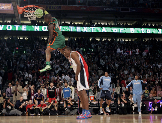 中新网2月15日电 北京时间2月15日,NBA全明星周末继续进行,其中深受全世界球迷喜爱的扣篮大赛火爆上演。身高只有1米70的“小土豆”内特-罗宾逊在决赛中做出了飞跃上届扣篮大赛冠军、身披“超人”斗篷的霍华德后扣篮的动作,这个被称为“飞跃超人”的扣篮使罗宾逊继2006年后第二次获得扣篮王,成为2009年全明星周末的扣篮冠军。