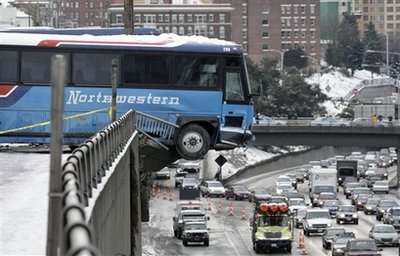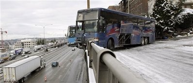 当地时间19日,美国西雅图市两辆共载有约80名学生的巴士在公路上相撞,两辆巴士都撞毁道路旁边的围栏,围栏外10多米下就是一条公路。其中单层巴士车头至前轮部分悬空,非常惊险。