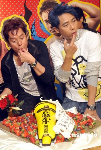 二月十四日晚,“香港二零零九东亚运动会.左麟右李演唱会”在香港红磡体育馆作尾场演出。图为十五日凌晨谭咏麟、李克勤在演唱会结束后出席庆功会。中新社发 邓庆乐 摄