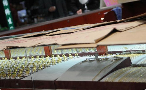 当营业员招呼“顾客”时,四名嫌疑人瞅准时机,迅速地将柜台上的玻璃掀起,伸手将柜台里的黄金手链、项链拿出装入随身带的白色包内。四人得手后迅速溜走。