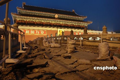 2月18日,为迎接新中国成立60周年,天安门管委会从当日起对金水桥实施保护修缮。据悉,此次修缮工作将分阶段进行,由于施工围挡防火板高度有限,因此金水桥和天安门城楼的整体景观和游览不会受到太大影响。工程拟于2009年5月1日前完工,并整体对外开放。中新社发 郑雄增 摄