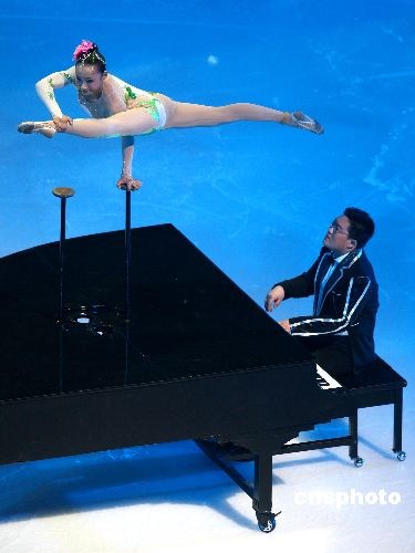 图为在开幕式上,钢琴上的杂技演出技惊四座。中新社发 富田 摄