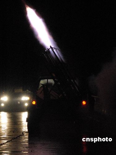 2月19日凌晨时分,山东枣庄,工作人员正在实施火箭人工增雨作业。当日,受西南暖湿气流和弱冷空气影响,山东枣庄出现降雨天气,当地气象部门抓住有利时机,在台儿庄、峄城等地进行大范围联合作业,以缓解旱情,这也是当地气象部门开展的第二次多方位集中人工增雨。到今天早上8时许,全市平均降雨量达到5毫米。中新社发 高启民 摄