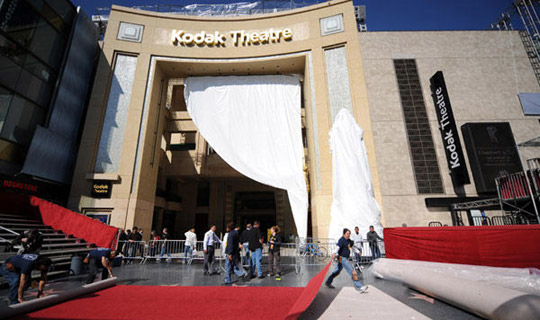 2月18日,在美国好莱坞柯达剧院,工人们正在门前铺设红地毯,准备迎接奥斯卡的颁奖典礼。第81届奥斯卡奖颁奖典礼将于22日在柯达剧院举行,将会有众多明星走过这条“星光大道”。