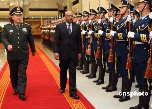 2月19日下午,国务委员兼国防部长梁光烈上将在北京八一大楼与来访的马尔代夫国防与国家安全部长费萨尔举行会谈,会谈前梁光烈上将陪同费萨尔检阅解放军三军仪仗队。中新社发 宋吉河 摄