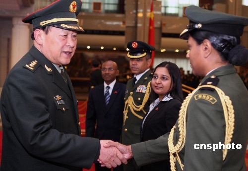 国务委员兼国防部长梁光烈上将,2月19日下午在北京八一大楼会见来访的马尔代夫国防与国家安全部长费萨尔及其陪同人员。中新社发 宋吉河 摄