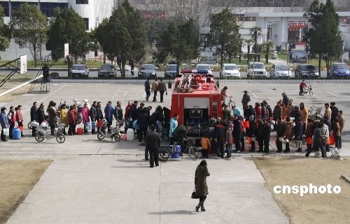 2月21日,江苏省盐城市各主干道上,消防车辆正为市民输送安全用水,确保盐城市民能够安心喝上未被污染的自来水。由于水厂受酚类化合物污染,盐城市区2月20日出现大面积停水,居民生活受到较大影响。造成本次停水的水源地污染原因已经确认,偷排污水的盐城标新化工有限公司被责令关闭,法人代表等相关责任人被采取强制措施。图为盐城市市委党校内前来取水的市民排成了长龙。中新社发 童盛 摄