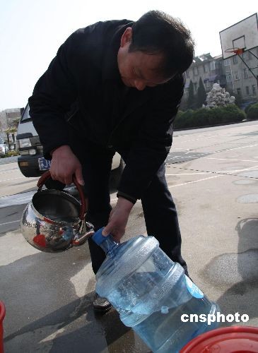 2月21日,江苏省盐城市各主干道上,消防车辆正为市民输送安全用水,确保盐城市民能够安心喝上未被污染的自来水。由于水厂受酚类化合物污染,盐城市区2月20日出现大面积停水,居民生活受到较大影响。造成本次停水的水源地污染原因已经确认,偷排污水的盐城标新化工有限公司被责令关闭,法人代表等相关责任人被采取强制措施。图为盐城市市委党校内前来取水的市民用纯净水桶取水。中新社发 童盛 摄