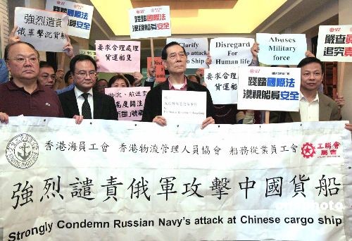 二月二十四日,香港船员及船务运输业界代表前往俄罗斯驻香港领事馆进行抗议,要求俄罗斯当局严惩肇事者,并对死伤者负责。二月十五日,由香港船公司租凭的货轮“新星号”遭俄罗斯海军炮击而沉没,造成八名船员失踪及死亡。中新社发 张勤 摄