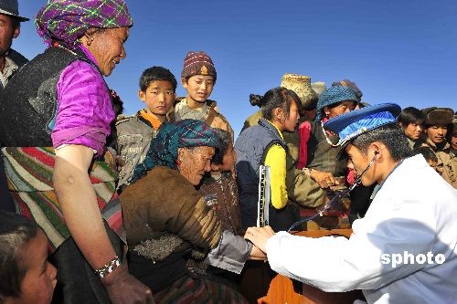藏历新年即将到来之际(2月25日为藏历大年初一),驻藏空军部队医务人员深入农户义务巡诊。中新社发 郭超英 摄