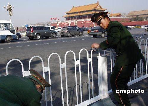 2月27日,全国“两会”即将召开,北京天安门广场进行全面清洁整理工作,以迎接“两会”开幕。中新社发 郑雄增 摄
