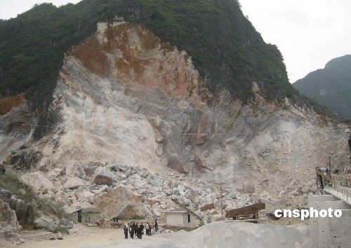 二月二十六日晚,广西河池市都安县一采石场山体大面积塌方,滚落的巨石摧毁山下一间房屋及三辆大卡车,造成一人死亡一人受伤。