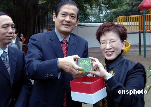 中国国民党中常委洪秀柱(右一),与福建省教育厅副厅长杨辉(左二)互赠礼物。